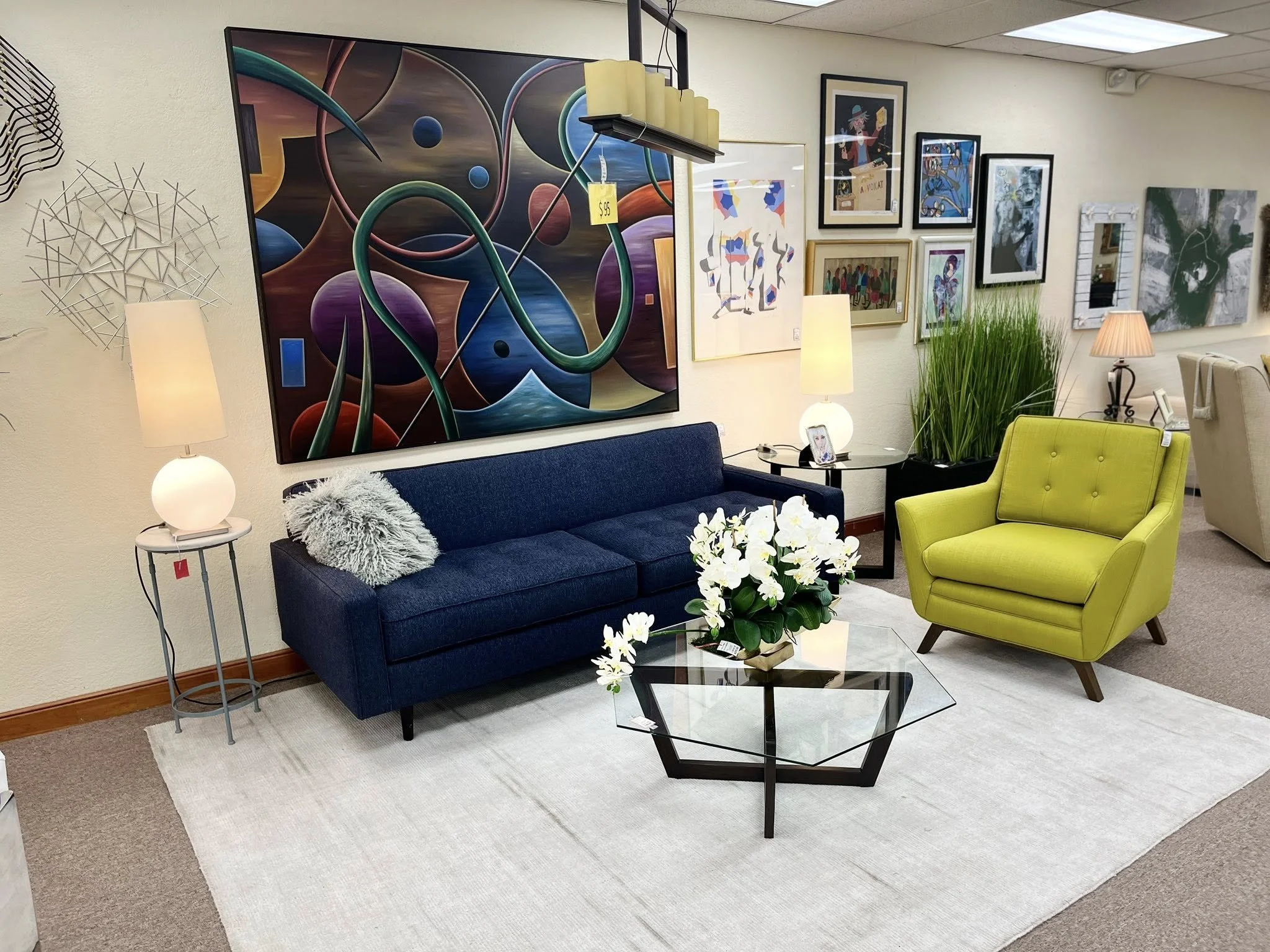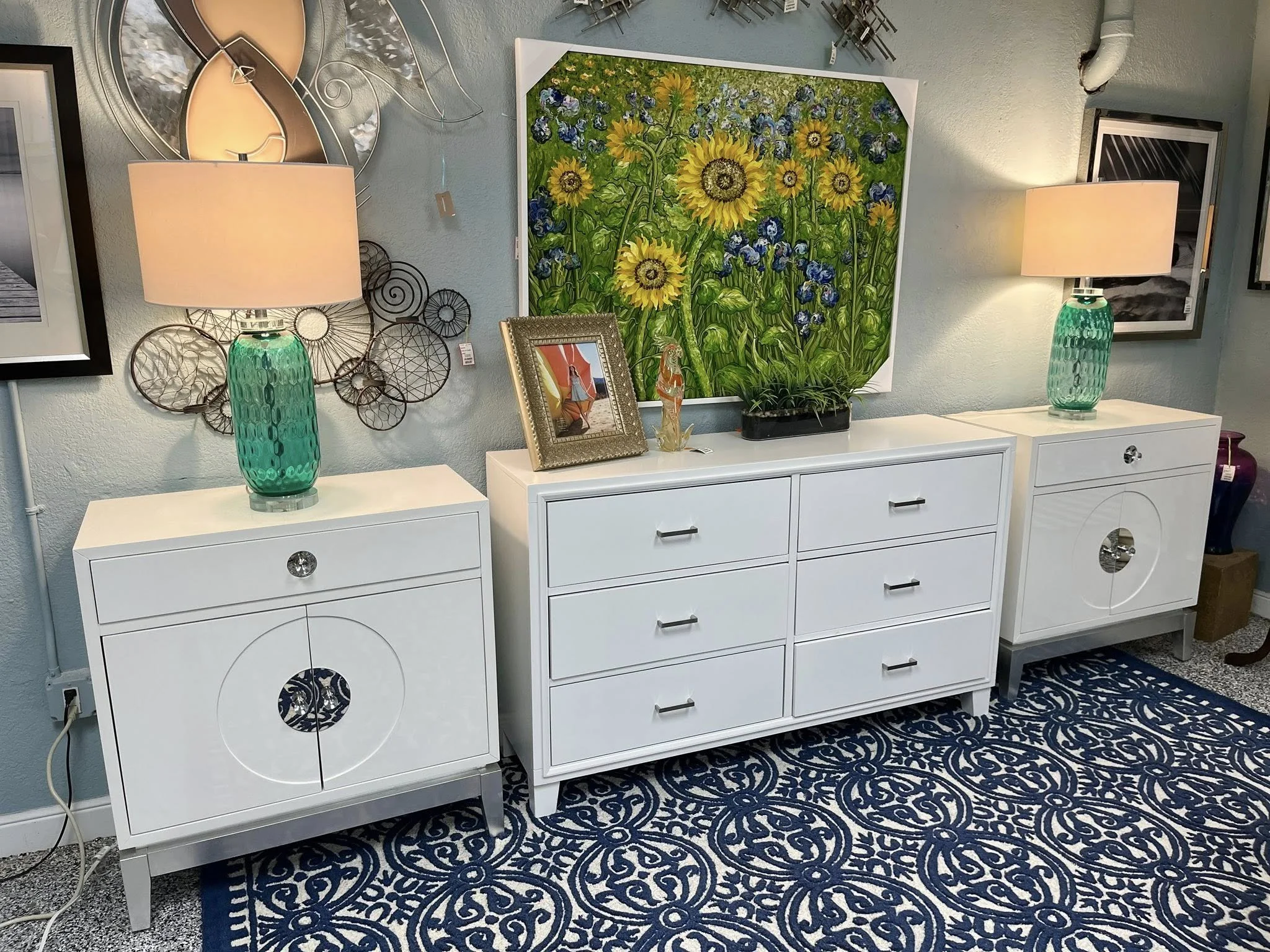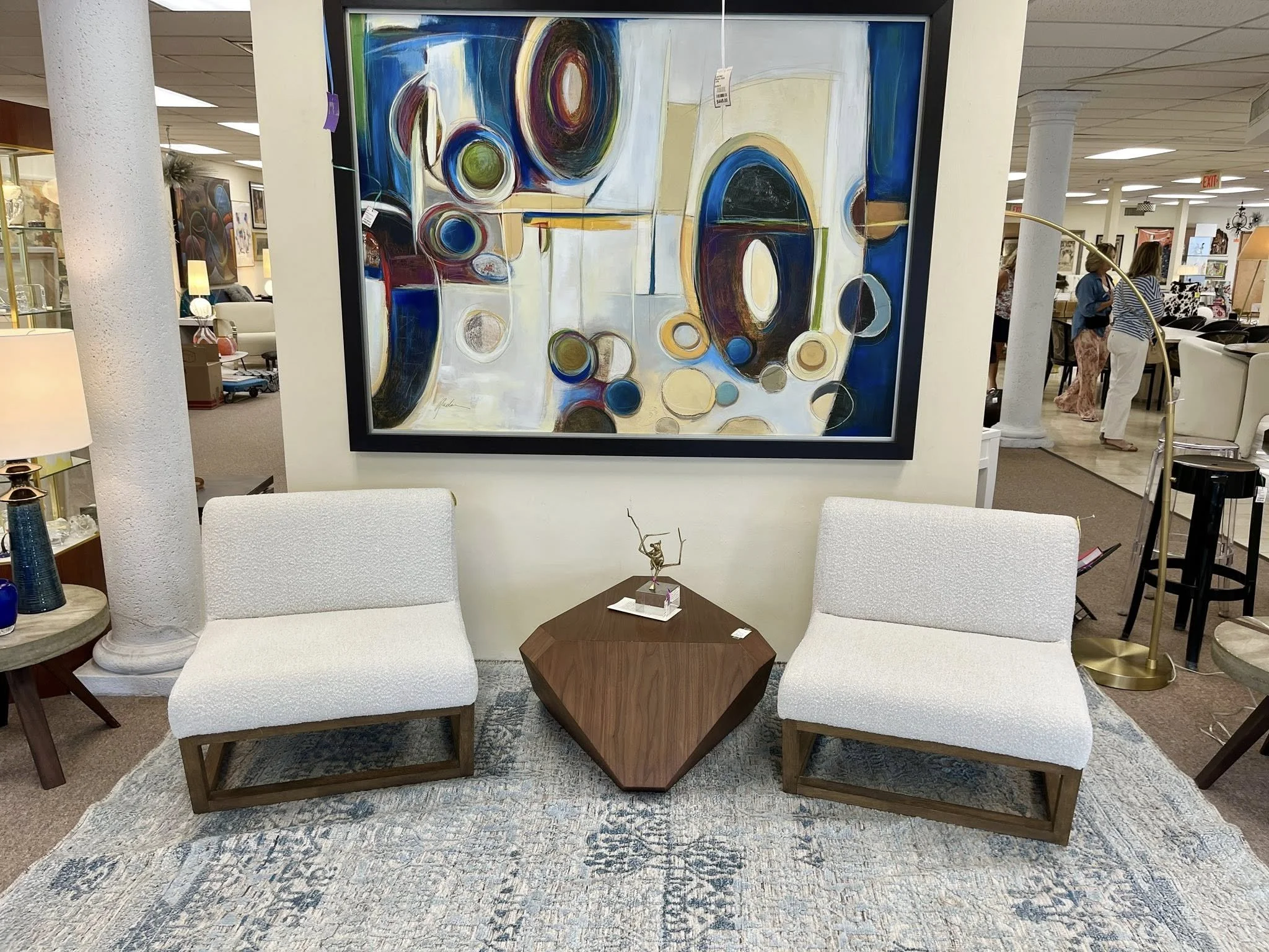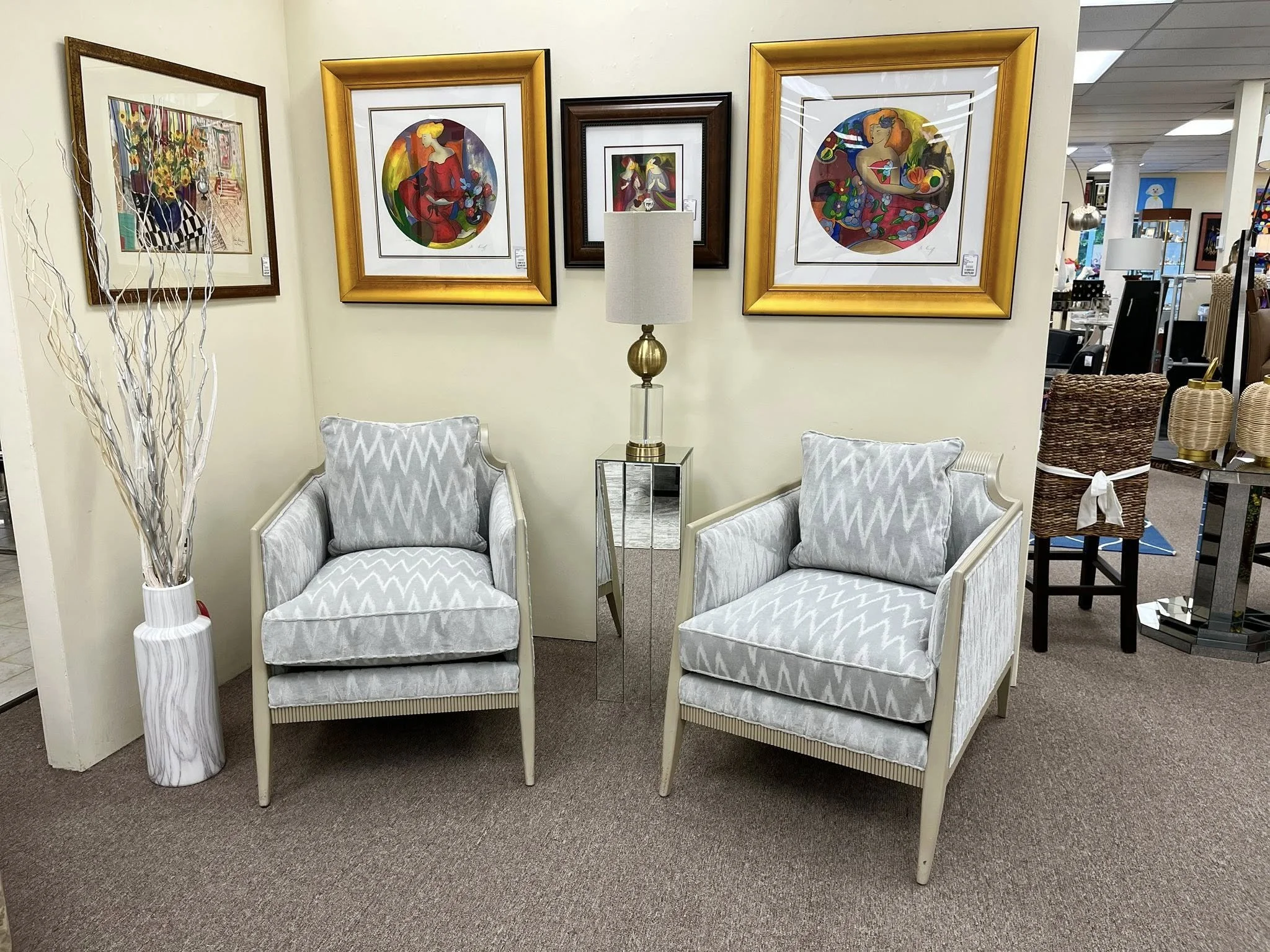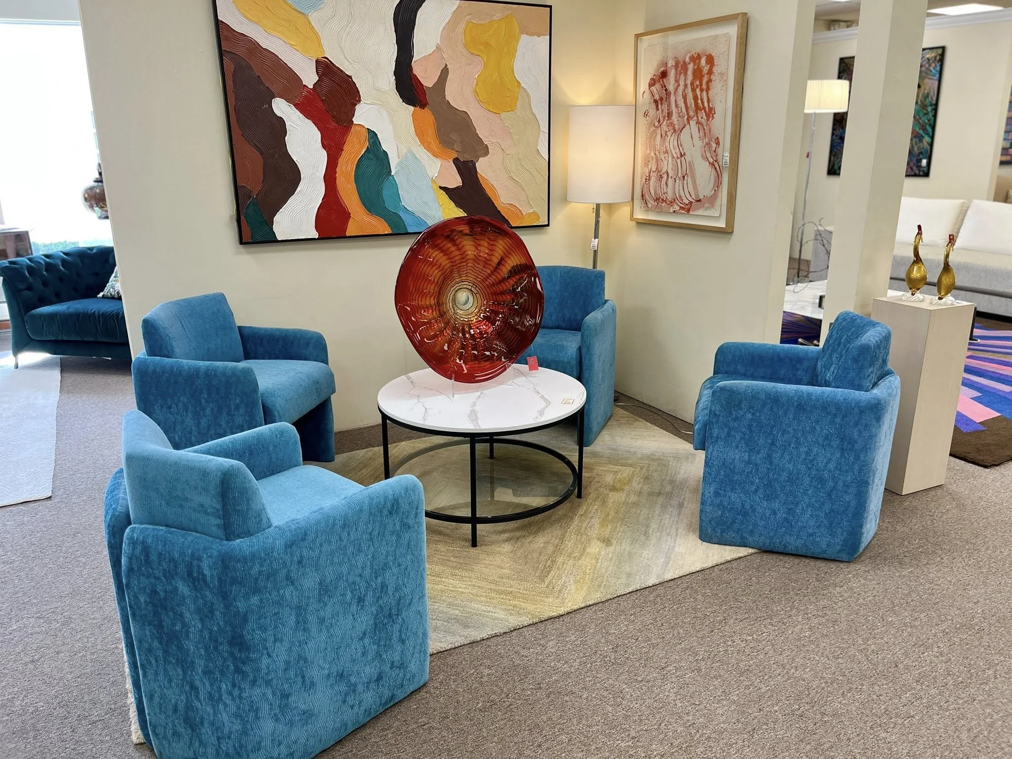 Turquoise Club Chairs, Lexington Chest (Sold), Sunburst Mirror