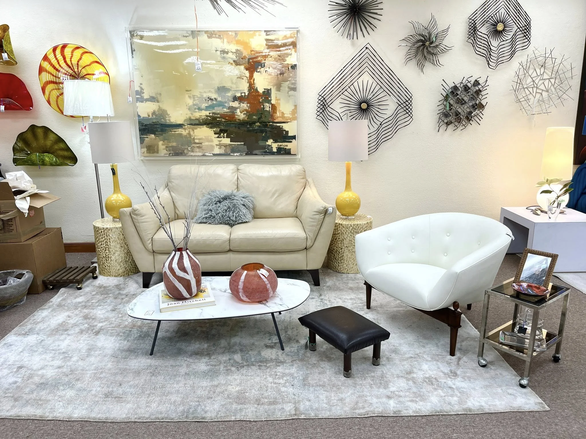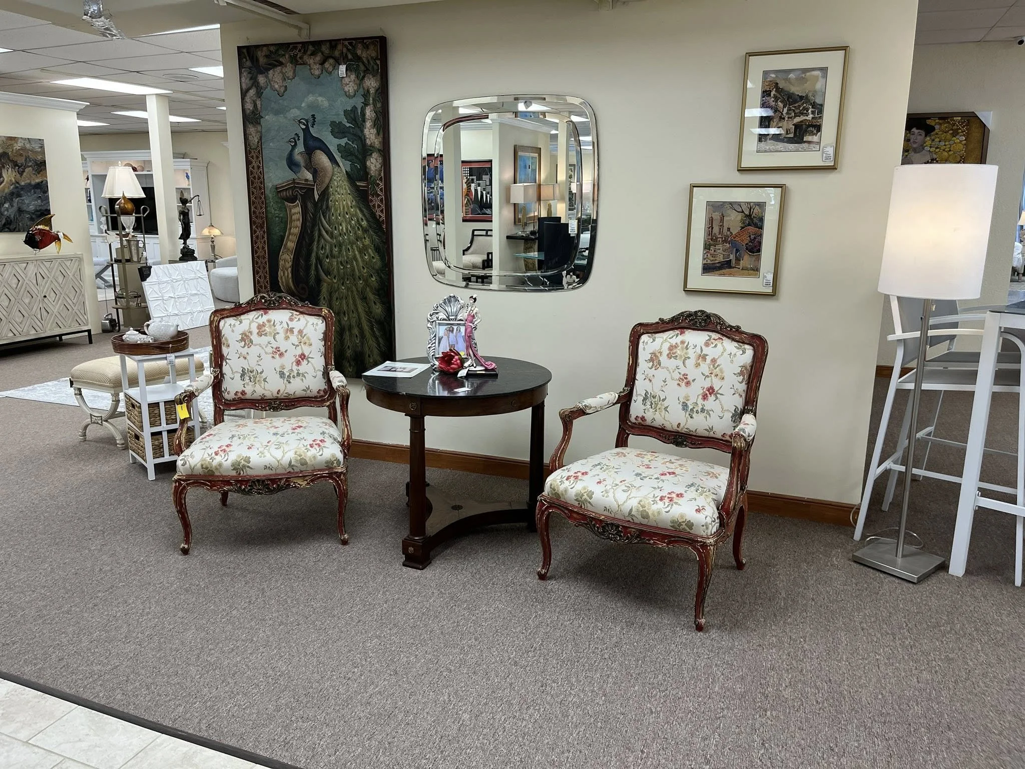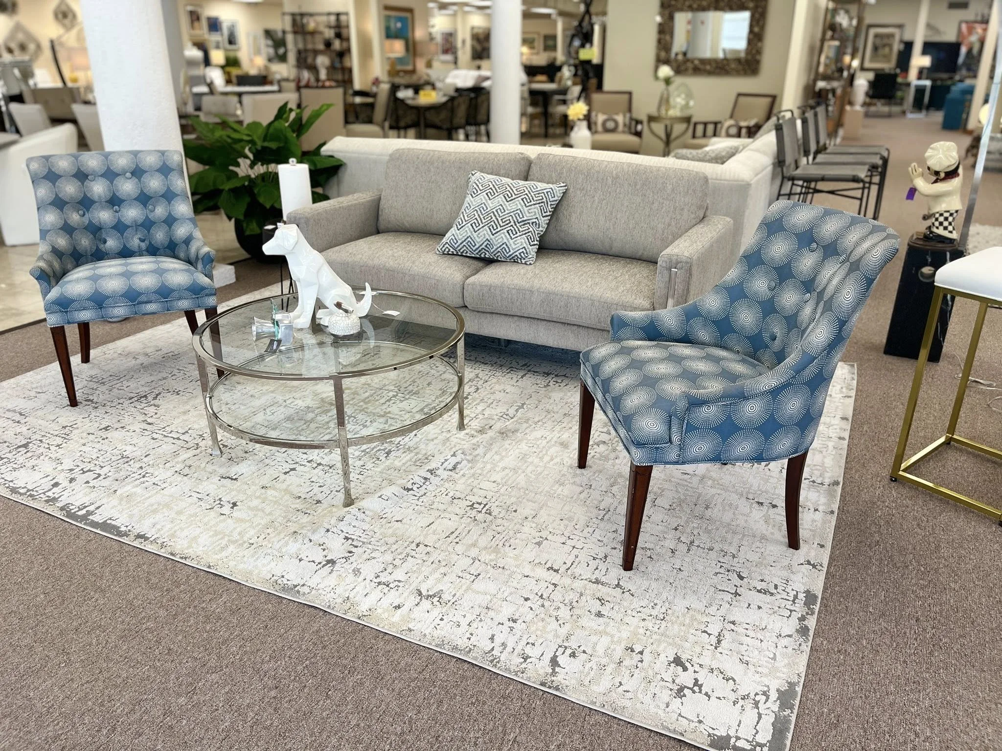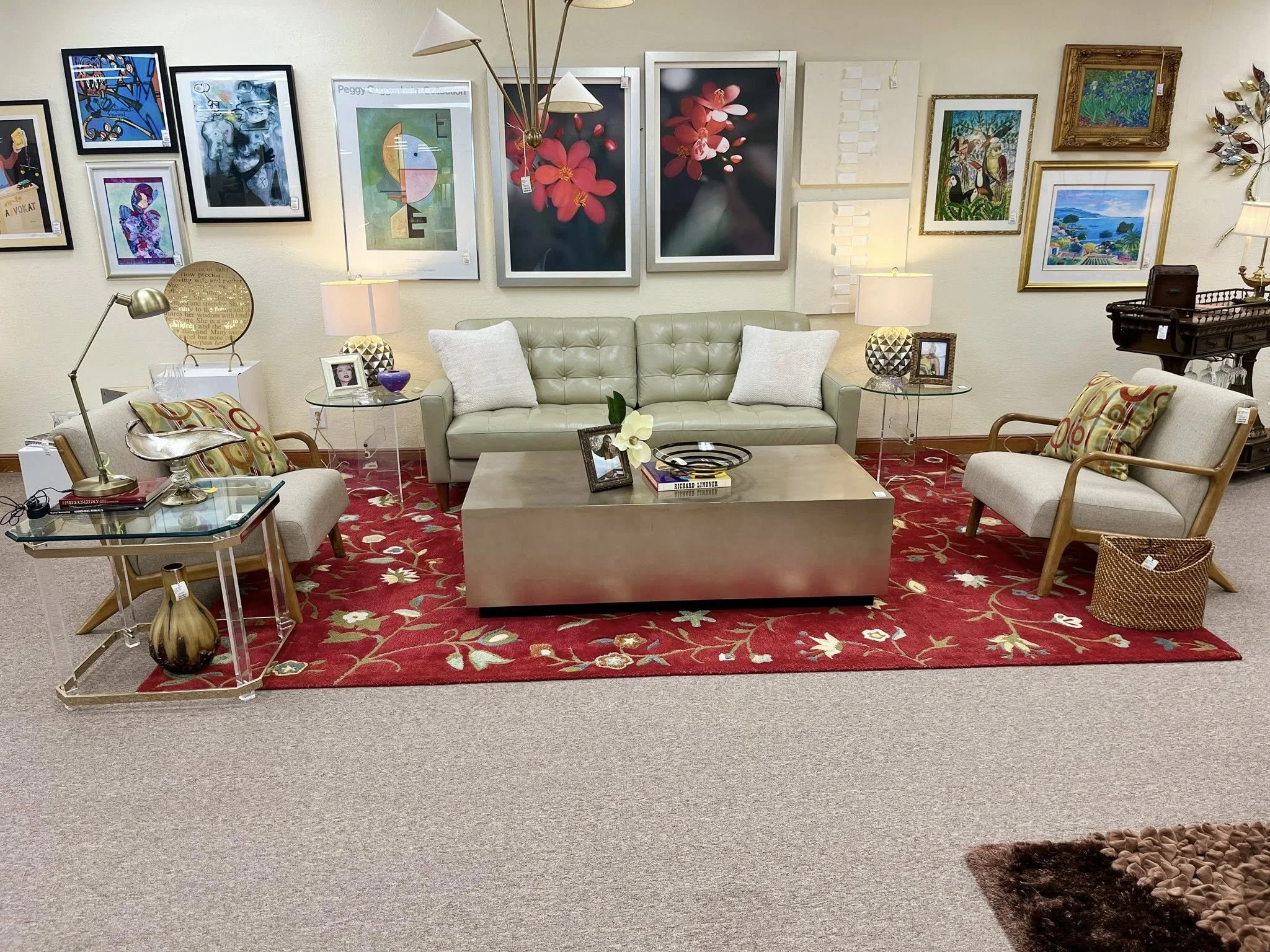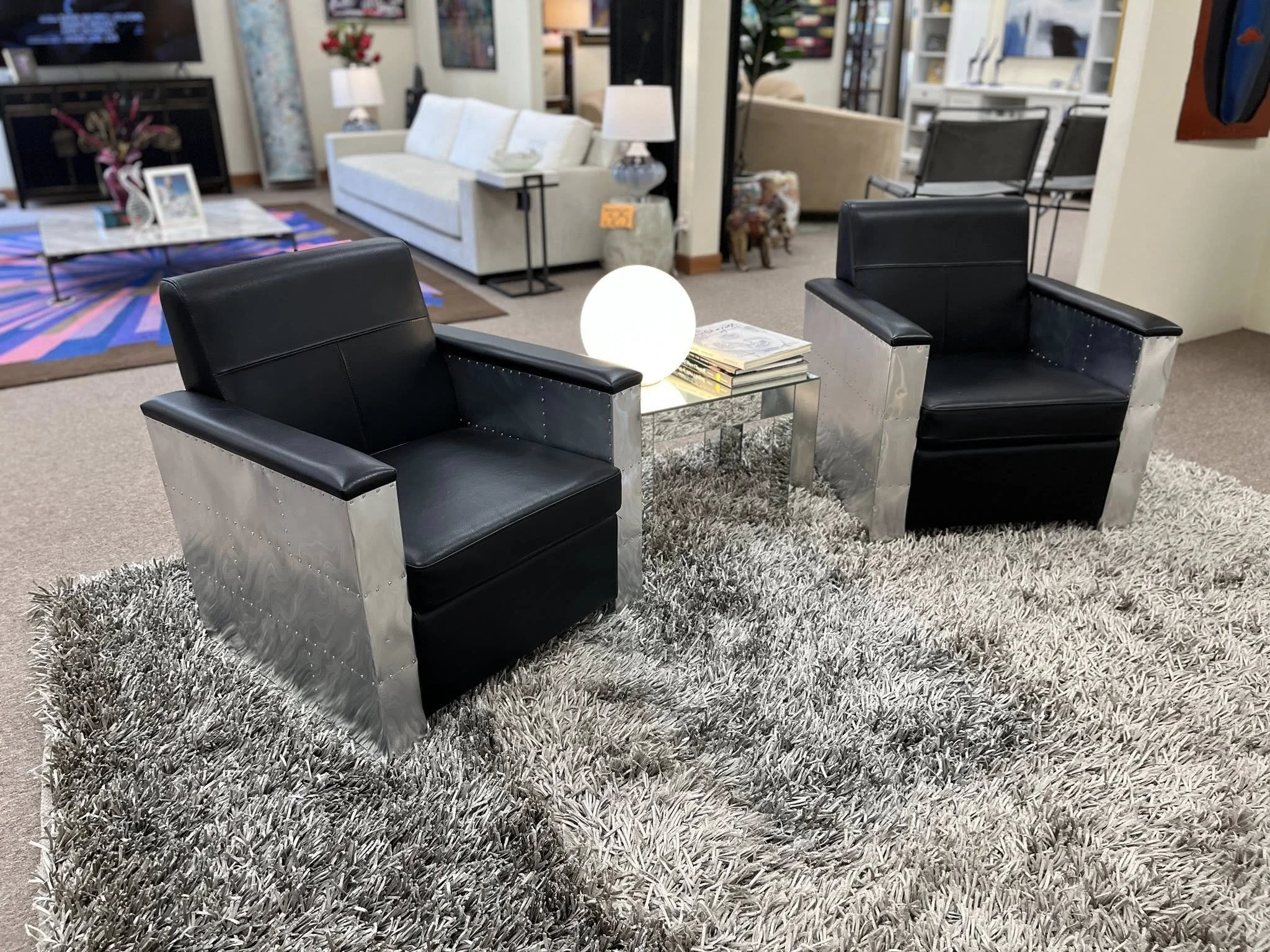 Turquoise Club Chairs, Lexington Chest (Sold), Sunburst Mirror