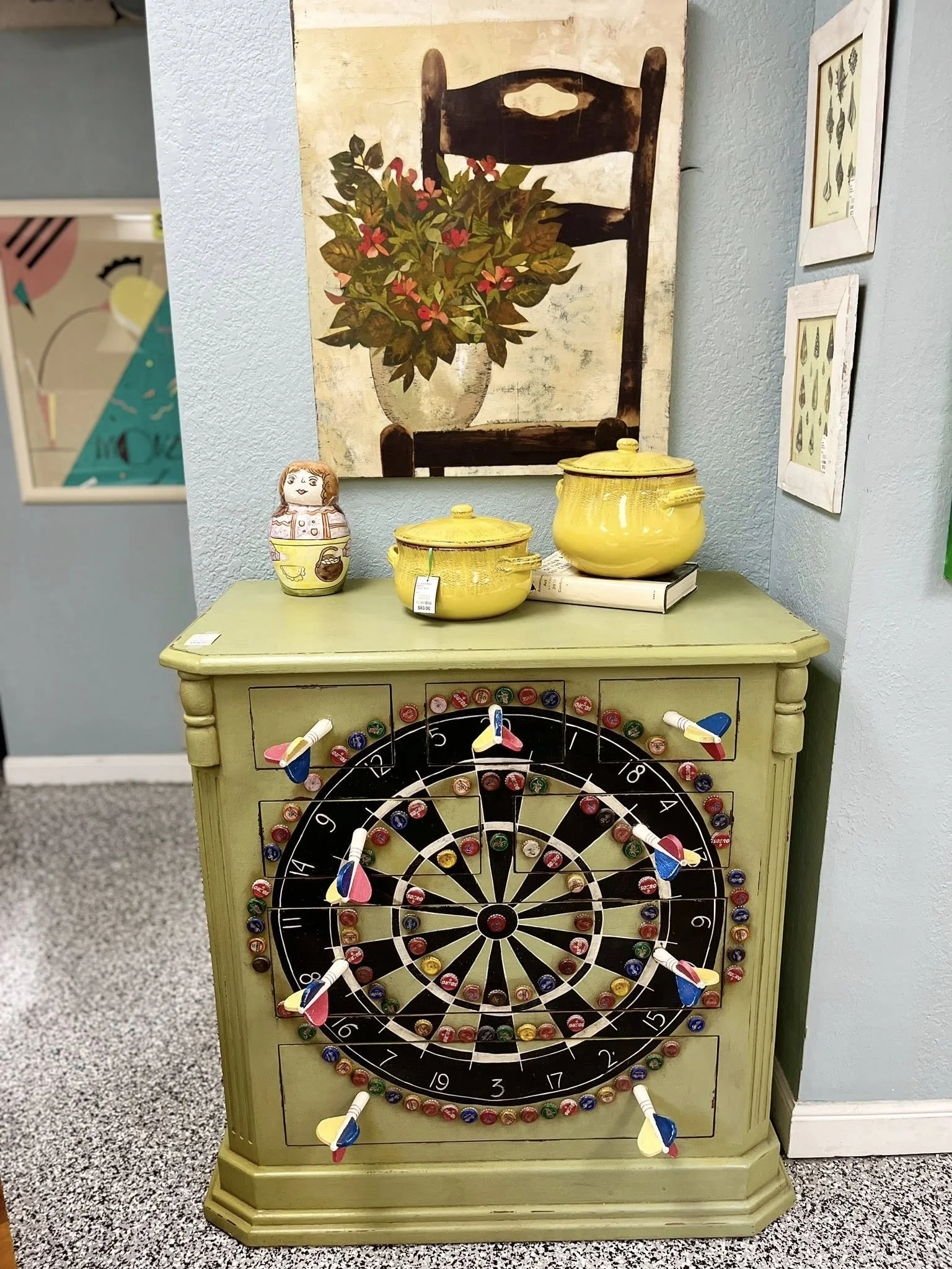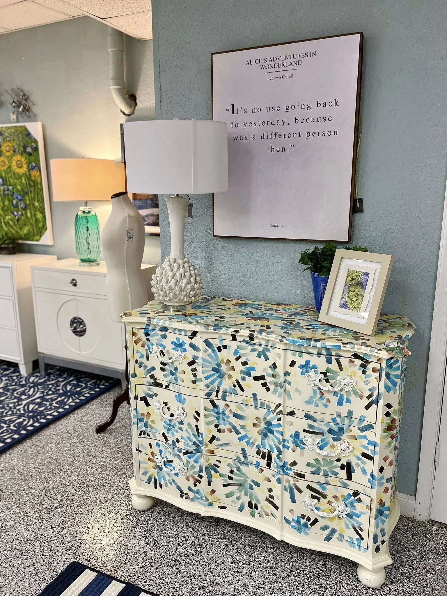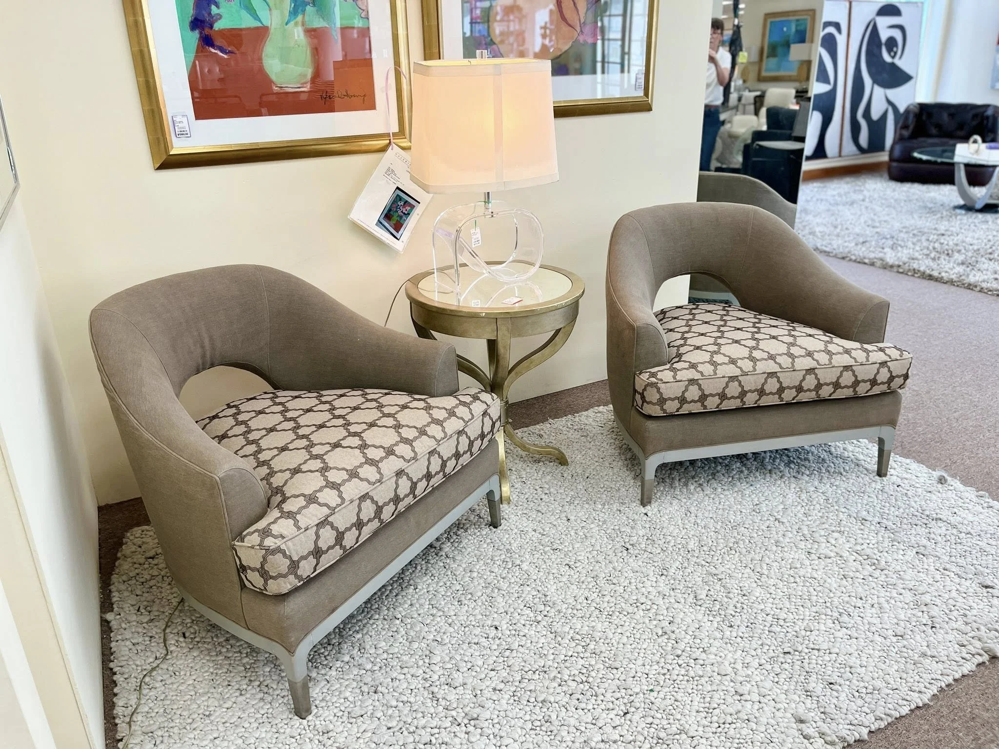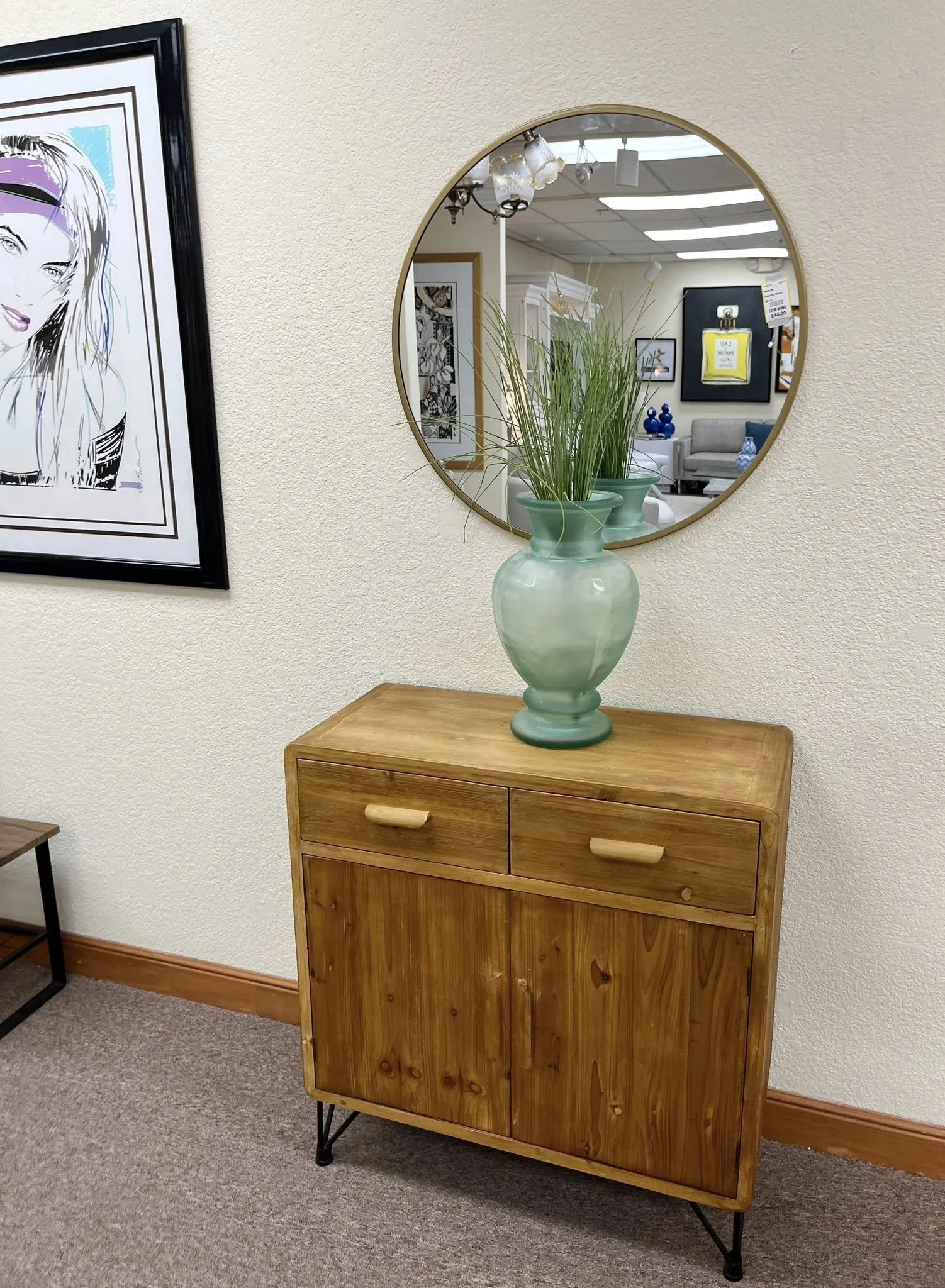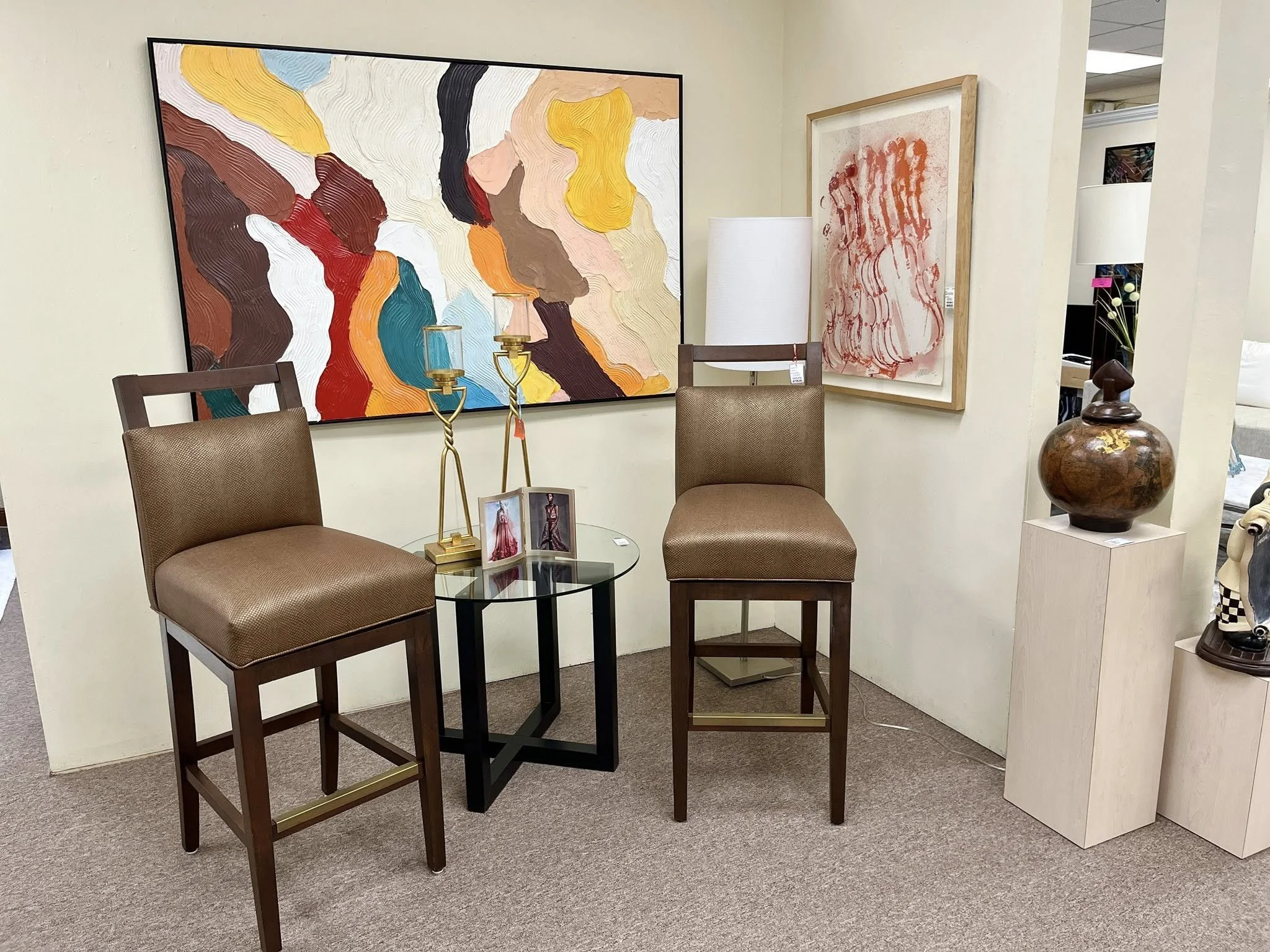 Turquoise Club Chairs, Lexington Chest (Sold), Sunburst Mirror